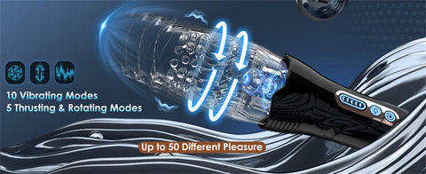 - Powerful 10 Vibrating Modes - The vibrator of this automatic male masturbators is built into the silicone sleeve for maximum, most exciting pleasure. Up to 10 different frequency vibration modes, with 5 thrustion and rotation modes, you are completely free to play and get 50 different stimulation experience from the sex toys, it's intoxicating and stimulating