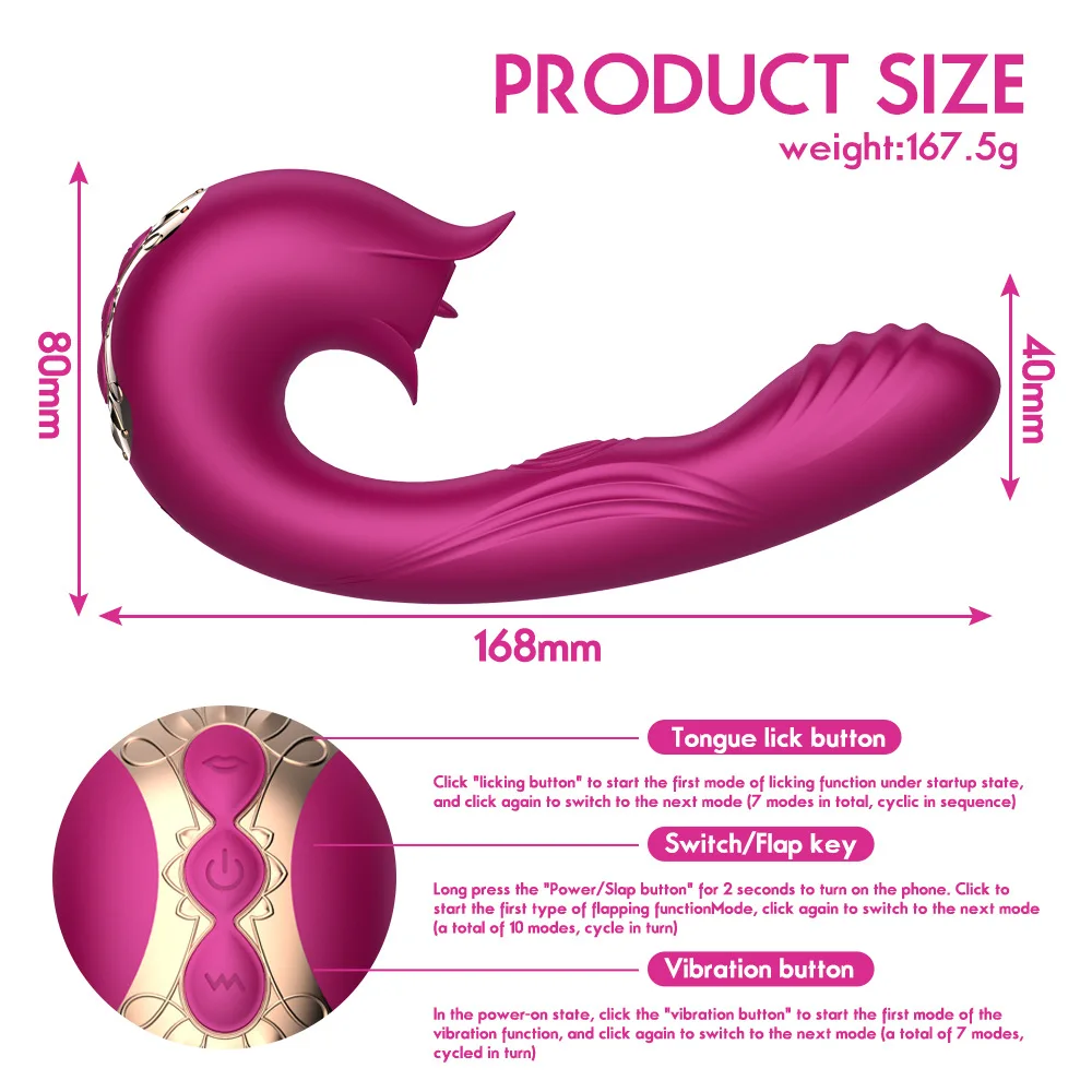 • Modes: 7 licking patterns + 10 vibration intensities